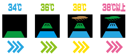 | 0℃から40℃までの気温に対応 緑色で表示される部分が測定値! 茶色は近値を測定! |