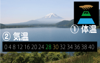 黒い部分に指(または額)を5~10秒あてます。 指をあてると富士山が浮かび上がります。くっきり浮かぶと適温状態。 富士山に雨が降ったら体温上昇中で要注意! (冬場など気温の低い場合には、体温がはかりにくい場合があります。) |