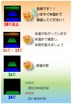 黒い部分に指を5〜10秒あてます。指をあてると富士山が浮かび上がります。くっきり浮かぶと適温状態。